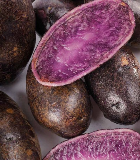 Tubérculo con un característico color azulado tanto en la piel como en la carne y un delicioso sabor. A su vez, hay distintos tipos de patata violeta, de pero la más fácil de encontrar se conoce como Vitelotte, de forma alargada, cilíndrica, oblonga, con la piel muy oscura fina y con muchos ojos hundidos, y una carne de intenso color violeta con algunas pinceladas claras según la pieza y textura mantecosa. Su recolección es tardía, por lo que se realiza a finales de año en los meses de invierno.